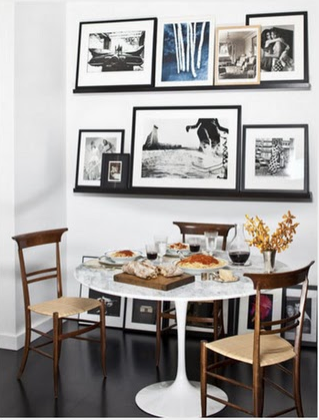 I was admiring this lovely set up for two of spaghetti and a carafe of wine, while also noticing the great picture ledge, pedestal table and rustic chairs. A perfect setting. {image via